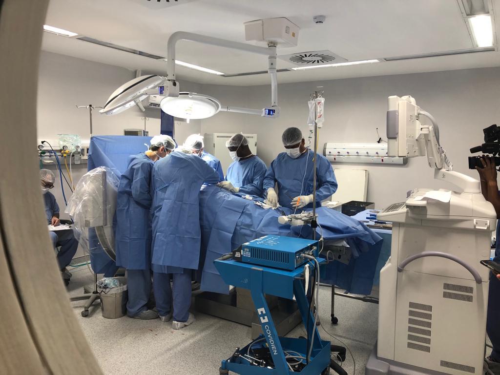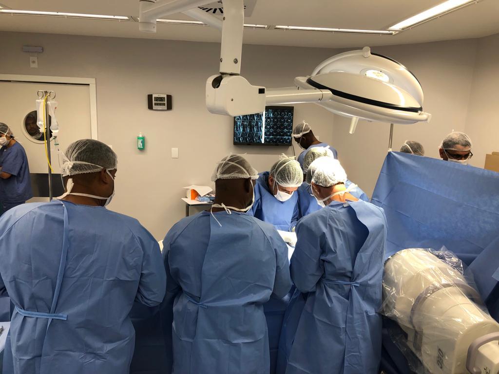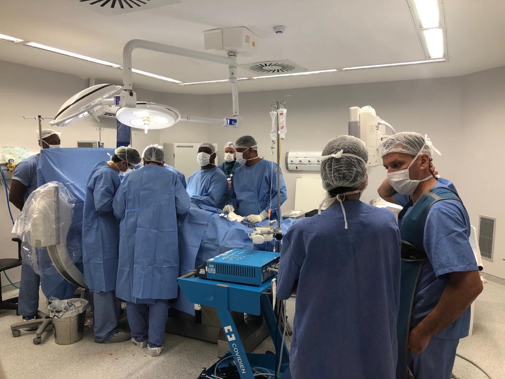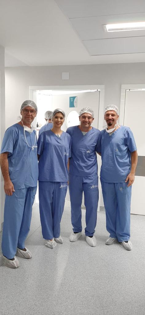 A equipe de cirurgia de coluna do Hospital Aeroporto, coordenada pelo médico Dr Alexandre Andrade, recebeu nesta quarta-feira (14), o cirurgião Dr Ritter Lang da Alemanha, referência em cirurgia de prótese de disco lombar. Juntamente com os dois cirurgiões estavam os médicos Heyder Ruan e Thiago Dantas para realização de procedimento cirúrgico inovador para tratamento de hérnia de disco cervical C5C6, com prótese de disco cervical M6-C, idealizada por Ritter, autoridade no assunto.